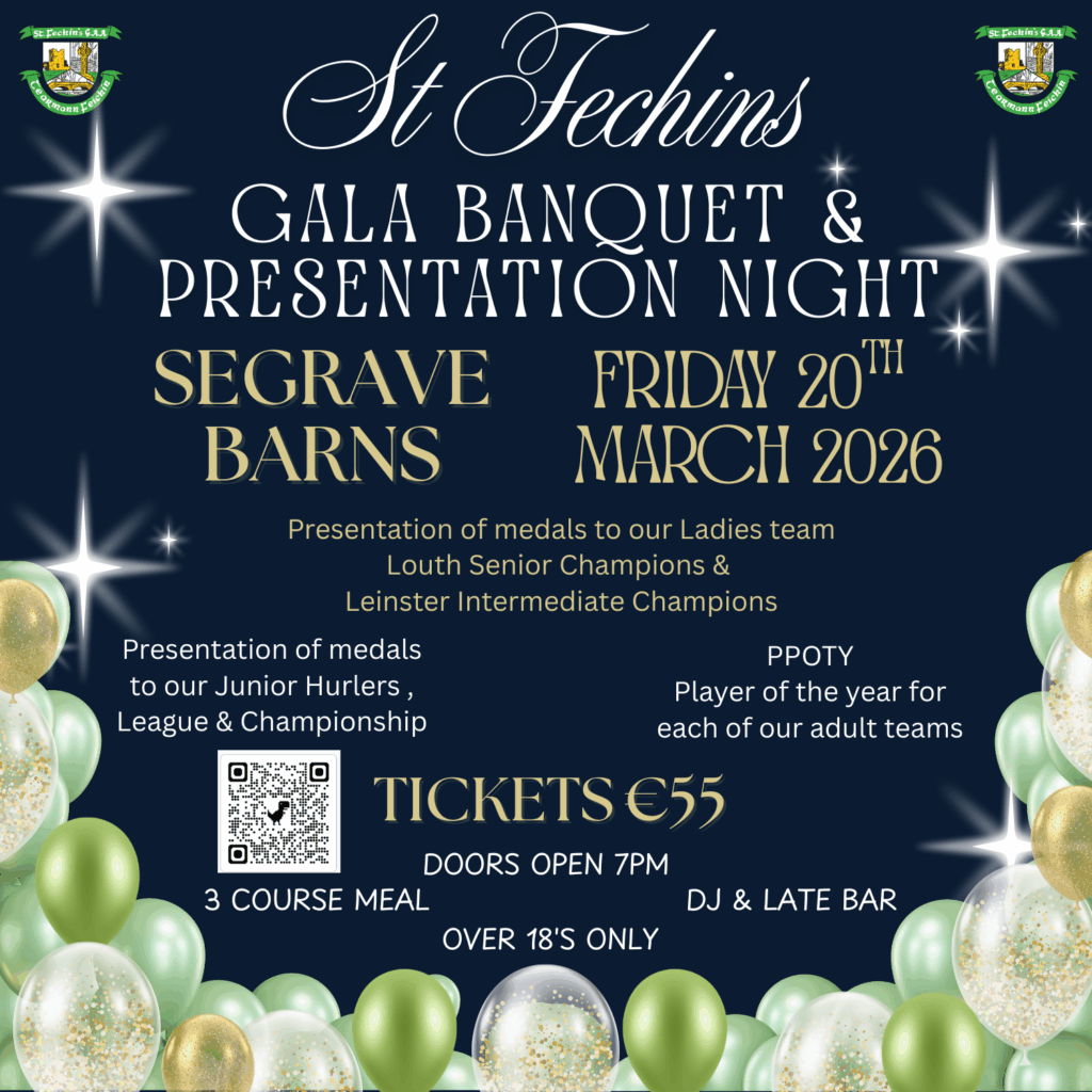 Join us on Friday 20th March 2026 in Seagrave Barns as we celebrate our clubs achievements in 2025 – and what a year its been – Two County Junior hurling titles and the History making Ladies who are Louth Senior and Leinster Intermediate Champions – It will be a great night  – tickets available online €55